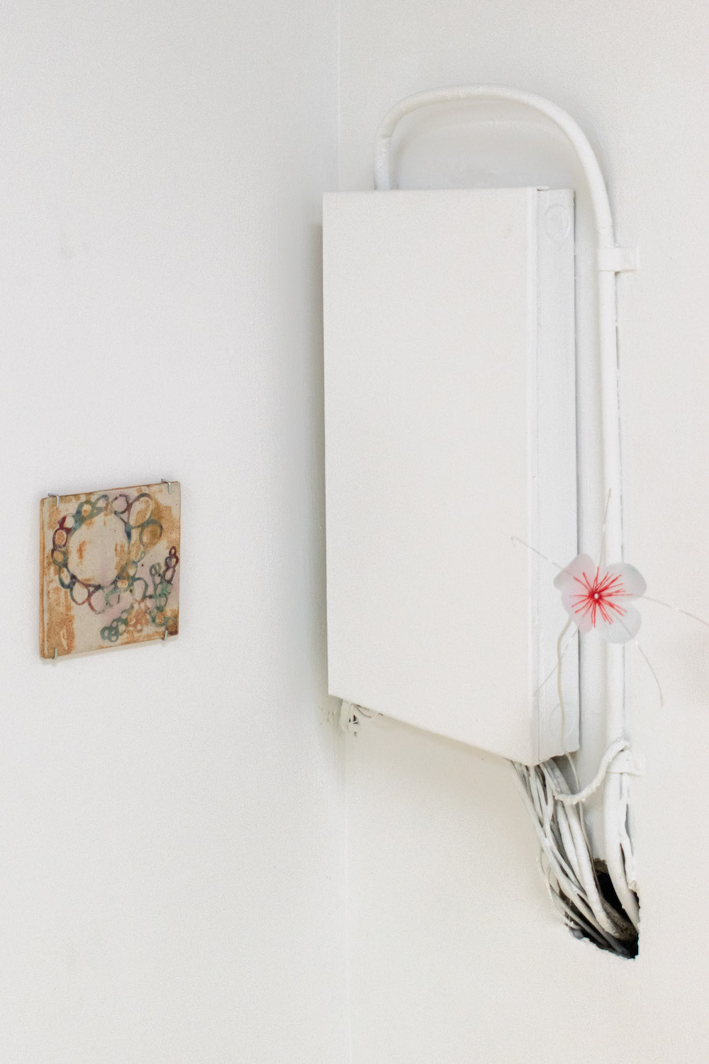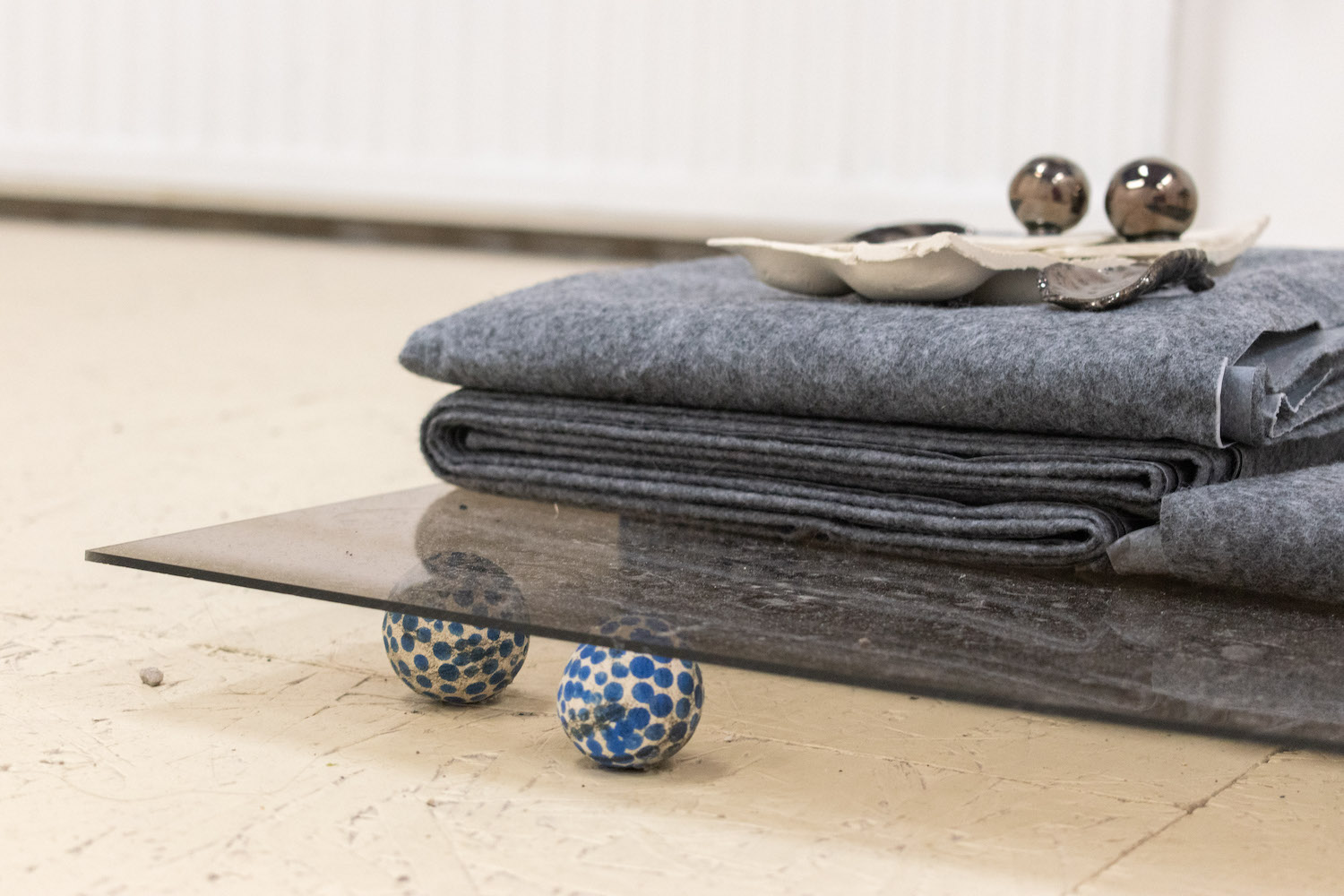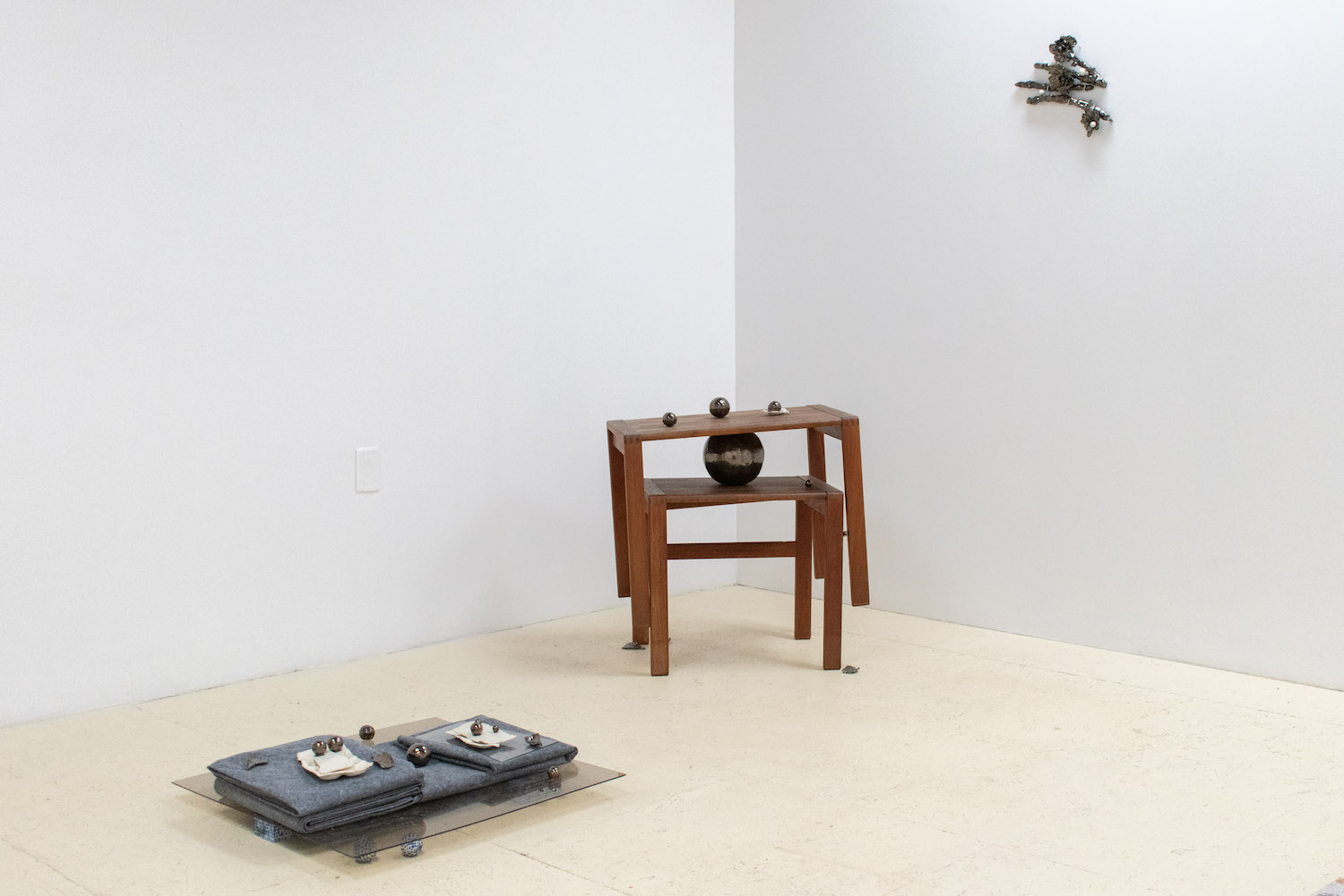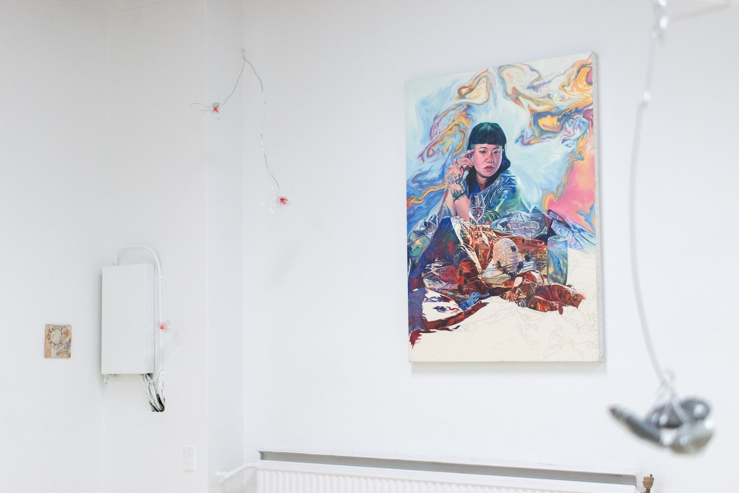 Biblical in origin, the idiom “at the eleventh hour” imparts resolution to a critical moment, usually in desperation. Implying the stress of time, the tenacity of work, belief systems, and oral tradition, the term’s sentiments appeal to us within contemporary usage. Spanning painting, sculpture, installation and ceramics, “At the Eleventh Hour” explores the interplay between labour, uncertainty and spirituality in the context of individual / collective experiences, personal / cultural mythologies, and art making as a laborious process. What external forces can carry on the work when we’ve reached our limits? Referred to as the “deus ex machina” within ancient Greek theater, actors who played angels were lowered onto stage to solve seemingly immovable problems through divine intervention. And so emerges a collective interest in structures of storytelling, theatricality, artifice, and the hero’s journey. In addition to an exhibition, “At the Eleventh hour” doubles as a stage for 3 play-inspired public performances set to occur towards the end of the show run.
